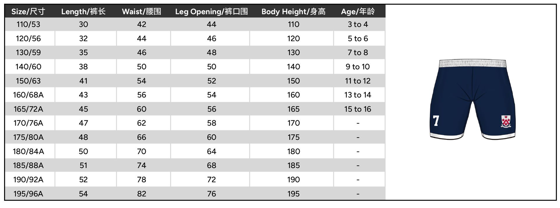 Size 110 or 120 or 130 or 140 or 150 or 160 or 165 or 170 or 175 or 180 or 185 or 190 or 195