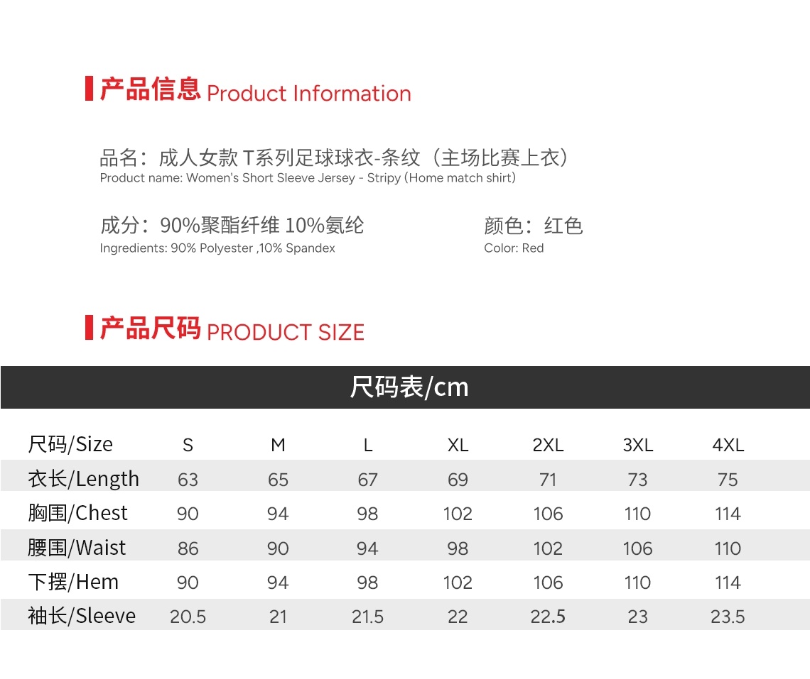 成人女款 T系列足球球衣-条纹(主场比赛上衣)